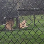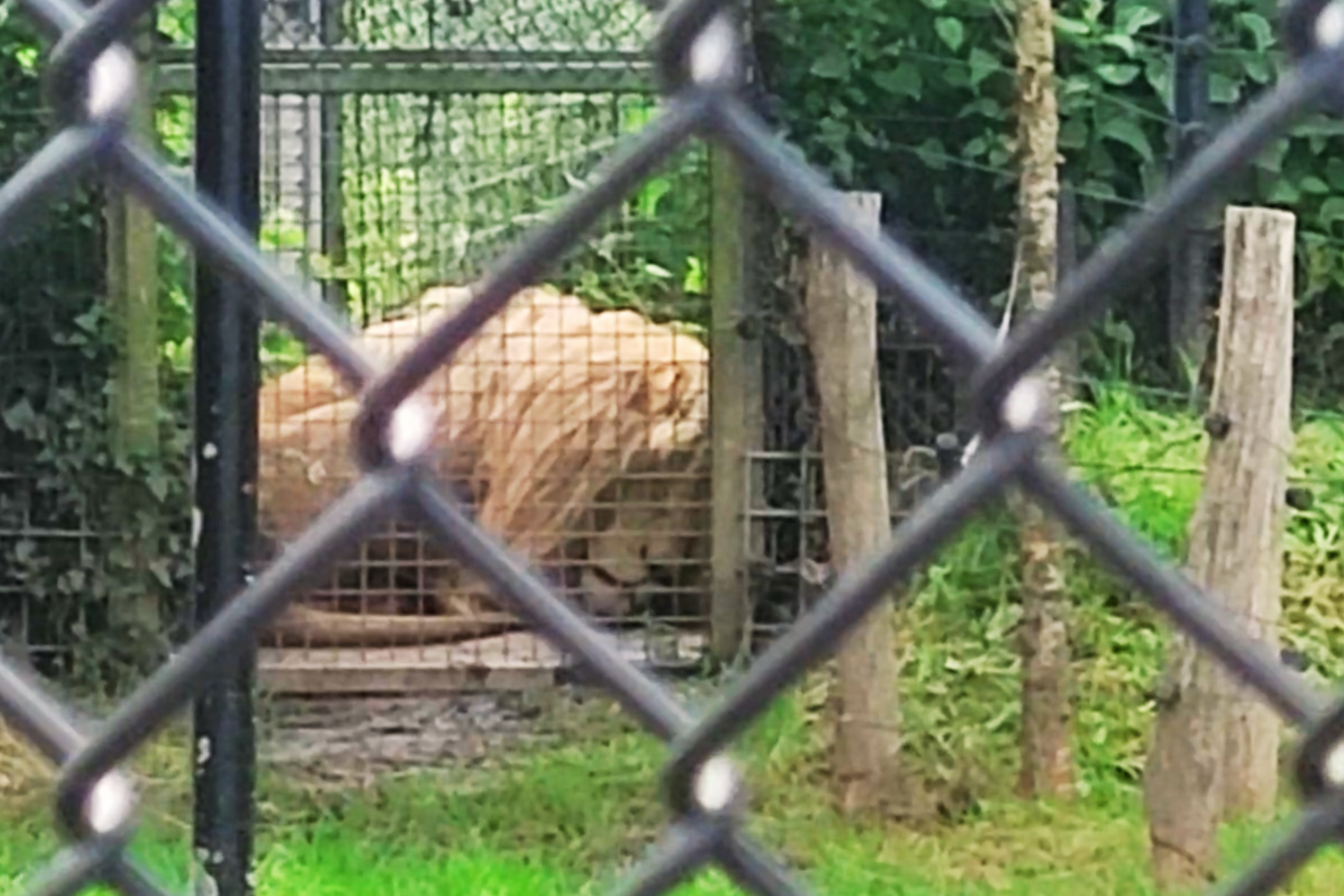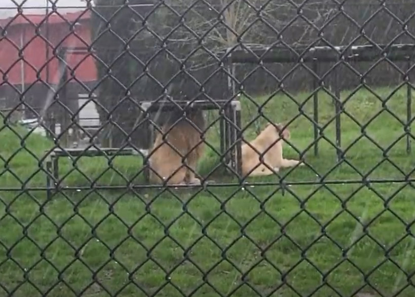 Gedurende de dag zitten de dieren buiten. Bij regen kunnen de leeuwen enkel schuilen onder een kleine verrijking van het verblijf: nauwelijks groot genoeg om beide onder te passen.